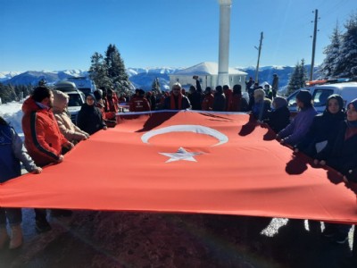 Bayrağı yaklaşık 30 dakikalık yürüyüşün ardından Sis Dağı'na getiren grup, karla kaplı dağlar arasında bayrak açtı.