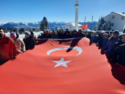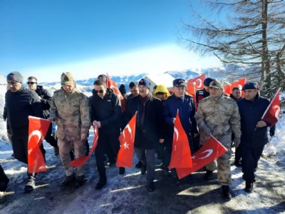 Şıhkıranı mevkisinde başlayan ve Sis Dağı'na kadar devam eden yürüyüşe katılanlar, yaklaşık 200 metre uzunluğundaki Türk bayrağının çevresinde toplandı.