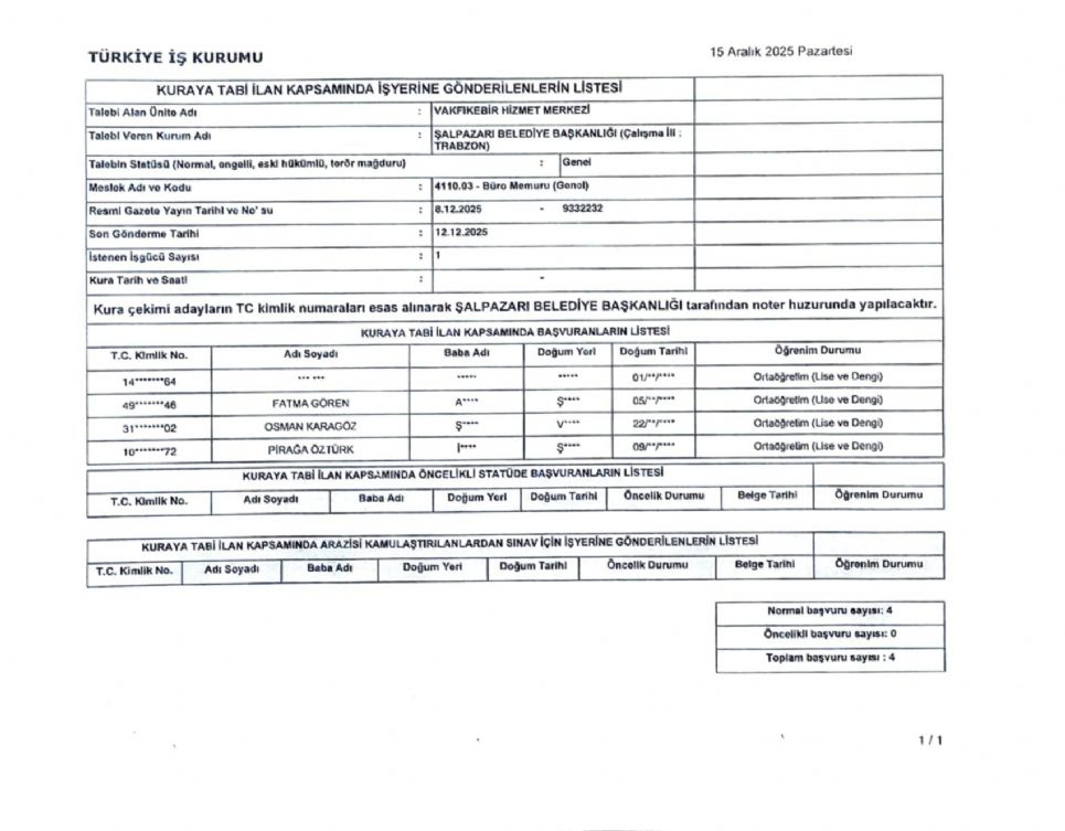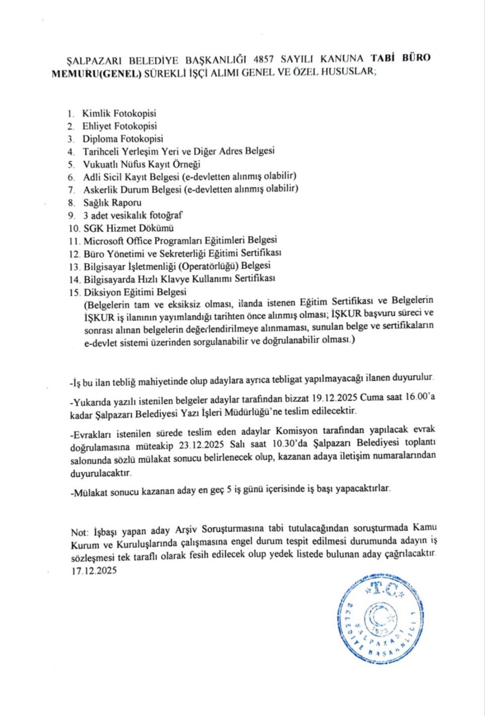 Belediye Başkanlığımızca '' Kamu Kurum ve Kuruluşlarında işçi alınmasında uygulanacak usul ve esaslar hakkında yönetmeliğin hükümlerine'' uygun olarak 08.12.2025-12.12.2025 tarihleri arasında İŞKUR üzerinden başvuranların nihai listesi ve 4857 Sayılı Kanuna Tabi Büro Memuru (Genel) Sürekli İşçi Alımı Genel ve Özel Hususlar ekte belirtilmiştir.