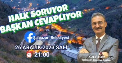30 Kasım 2023 Perşembe akşam saat 21:00 de, Şalpazarı Belediyesi Facebook Sayfası üzerinden yapılacak canlı yayında , Gazeteci Yazar Aydın Gelleci , Gazeteci Tayfun Günaydın ve Şalpazarı halkı soracak, başkan Refik Kurukız...